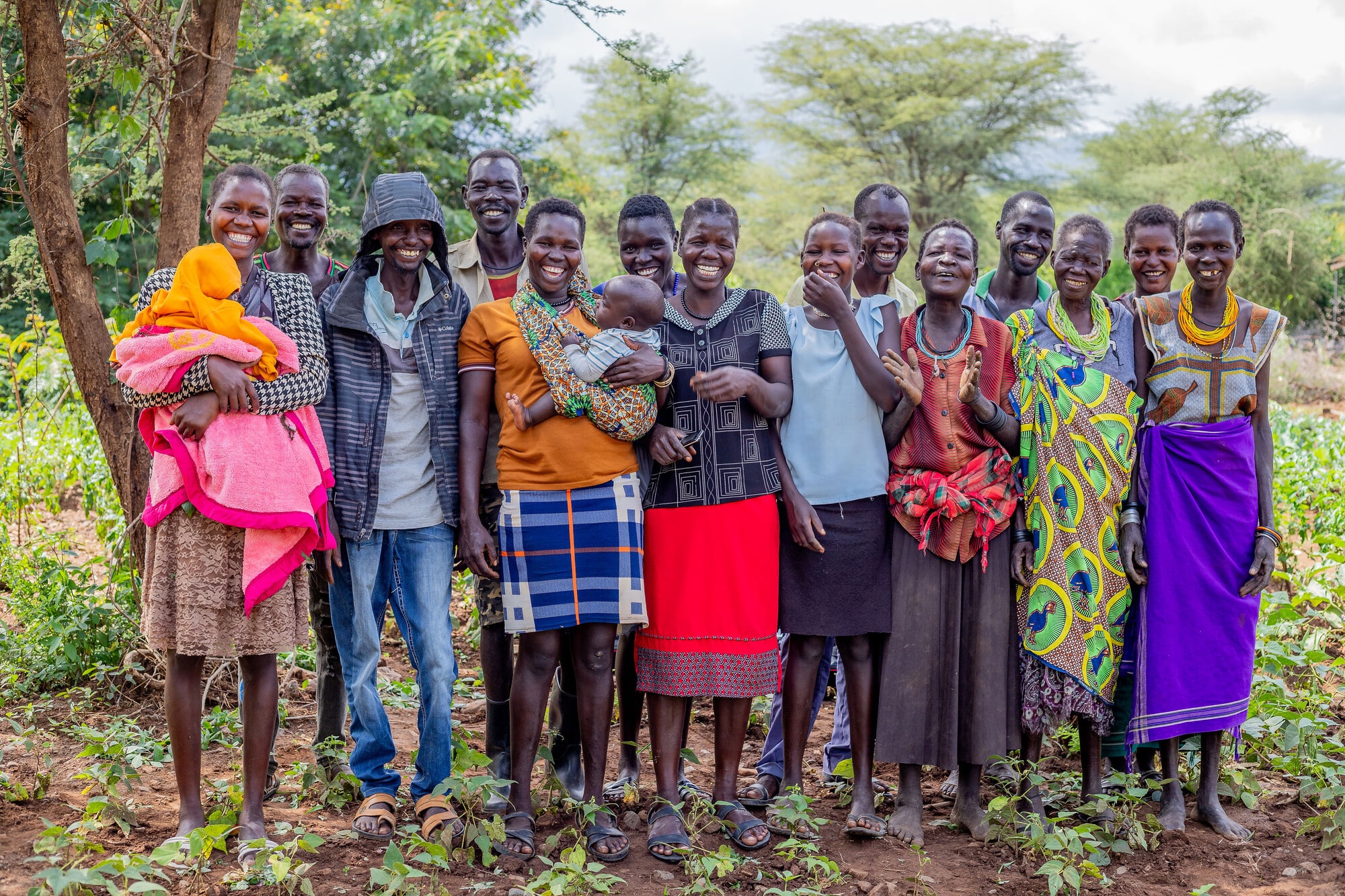 Florence Otyang and other members of the Naukoi Riverside Farm Group working together to grow nutritious vegetables on a demo plot.